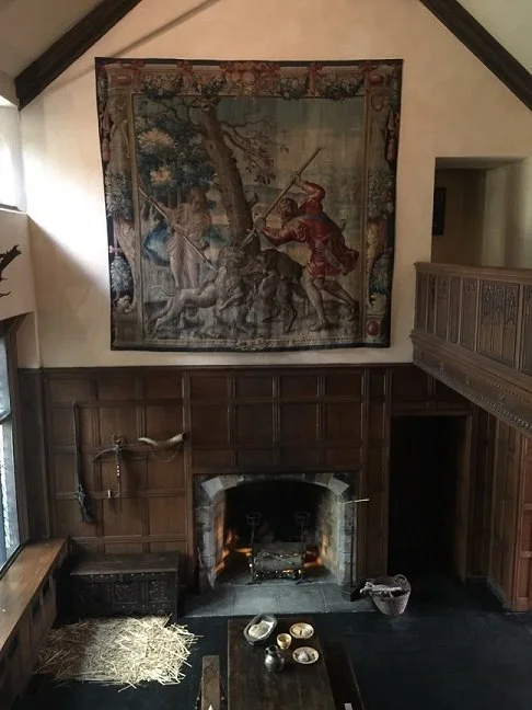 In our collection at Agecroft Hall, we have about ten tapestries. Tapestries were very expensive and indicated that the owner was a wealthy person. Tapestries also brought warmth and color to drafty manor homes and castles--some tapestries were even hung over doorways with slits cut in them to cut down on drafts. While most of our tapestries seem to be predominantly green or blue, these woven pieces were once vibrantly hued to provide color in dark rooms, especially in the colder months when natural light becomes scarce so early in the day.
