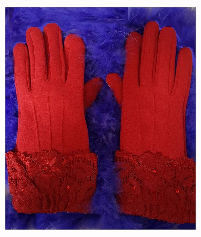 Measure a piece of lace to cover the length of the wrist end of each glove on the top side. Glue this lace into place.