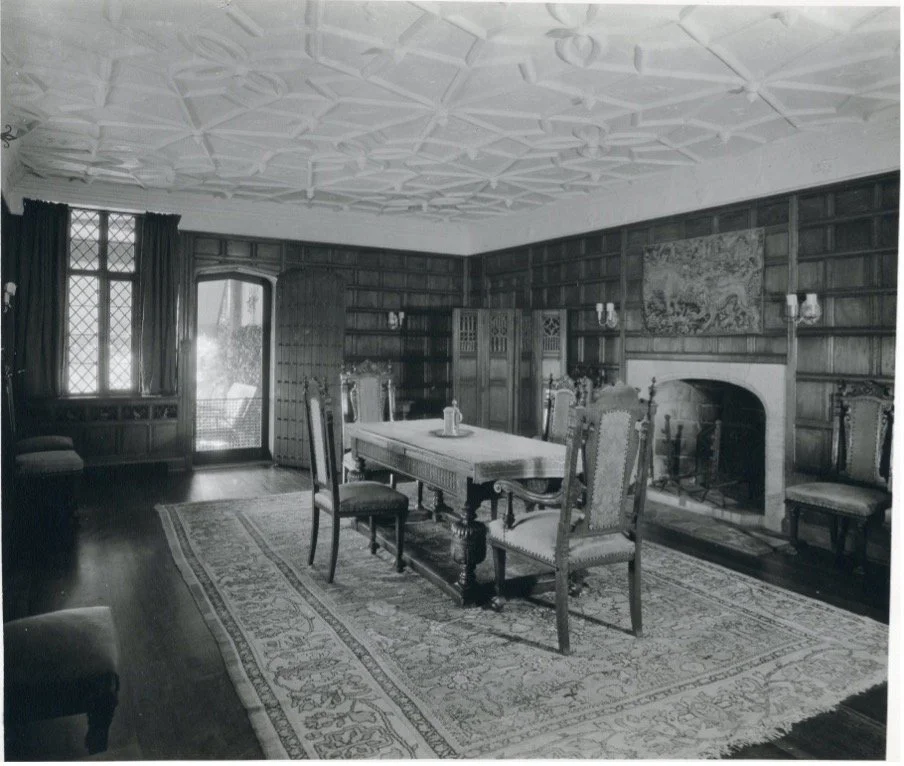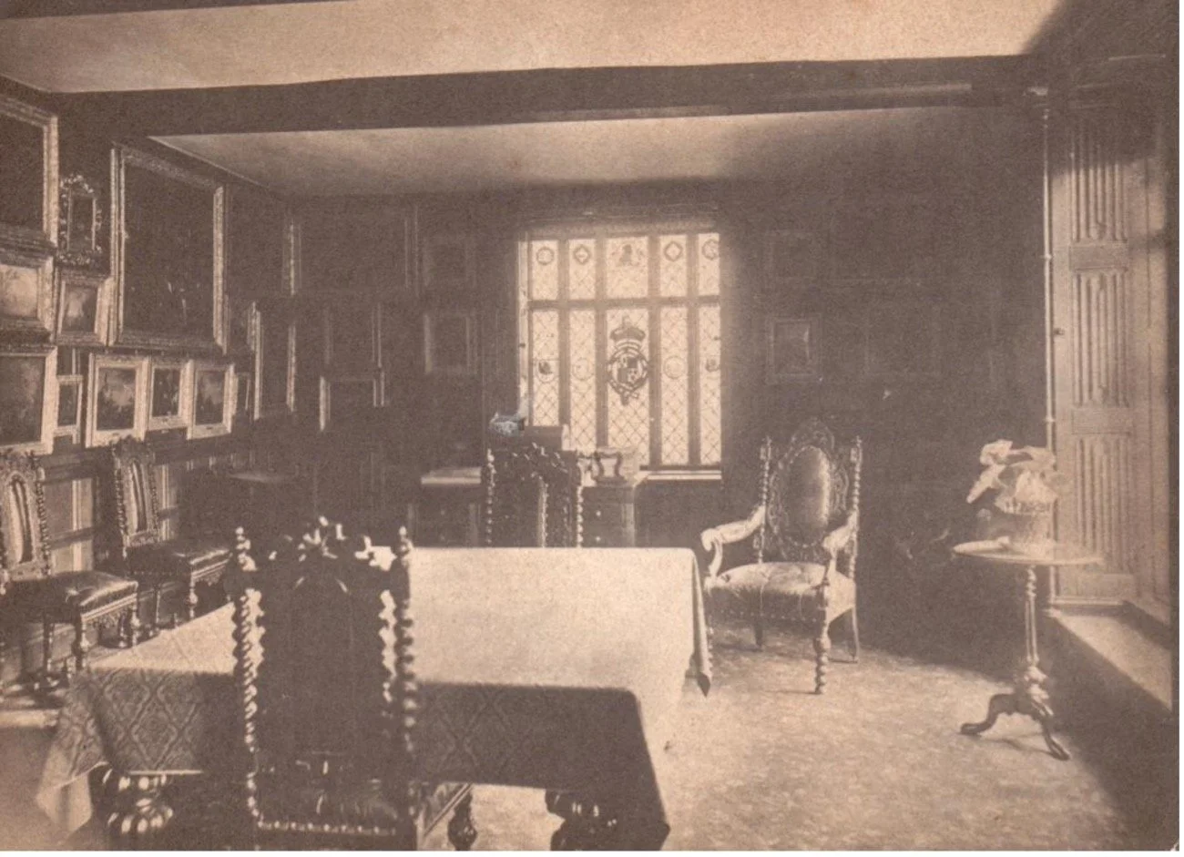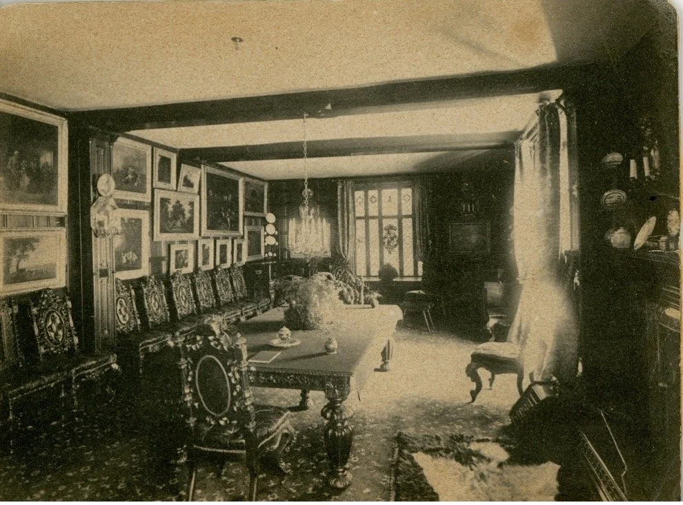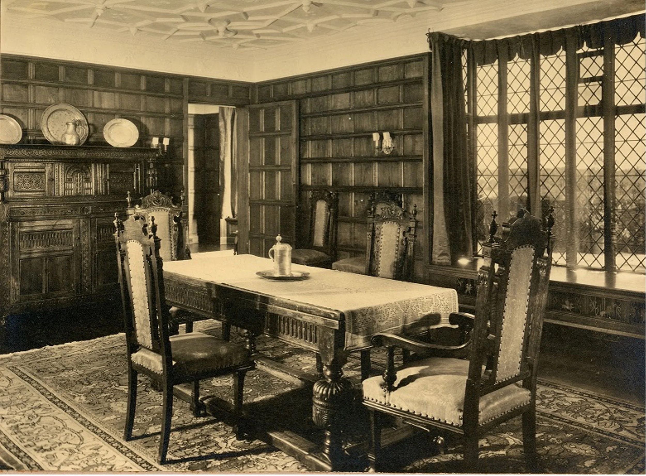 Rooms in a Victorian home were gendered: dining rooms were masculine; bedrooms and sitting rooms were feminine. The interior decoration of a Victorian English dining room reflected its masculine ambiance. This effect was achieved with dark wood, carpeting, and wallpaper, creating a dark space. Dark green and red upholstery and patterned wallpaper were popular. A sideboard was an essential piece of furniture topped with various decorative items. It was customary to fill the room with as much furniture and decorations as possible, centered around a large table. Through photographs, it is evident that Agecroft’s dining parlor was decorated following these trends. There is an elaborate sideboard centered on one wall covered in various décor pieces. There is a hefty center table, flanked by numerous ornately carved chairs, walls overwhelmed with framed artwork, and numerous carpets on the floor. The John of Gaunt window, on display in our Sunroom, can be seen in situ at one end of the dining room as well.