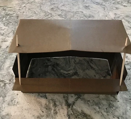 This next part is a bit tricky. Poke holes in the roof near the front on both sides with your toothpick or the point of a pen. Be careful. You may need someone else to help you. Make them as even as you can. You may want to use a ruler to measure spacing.