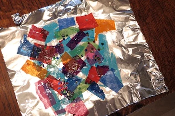 1. Cut a large piece of foil and spread with PVA glue on the shiny side. Help your child to rip pieces of different coloured tissue paper and glue down onto the foil. Add other decorations too with plenty of glue.