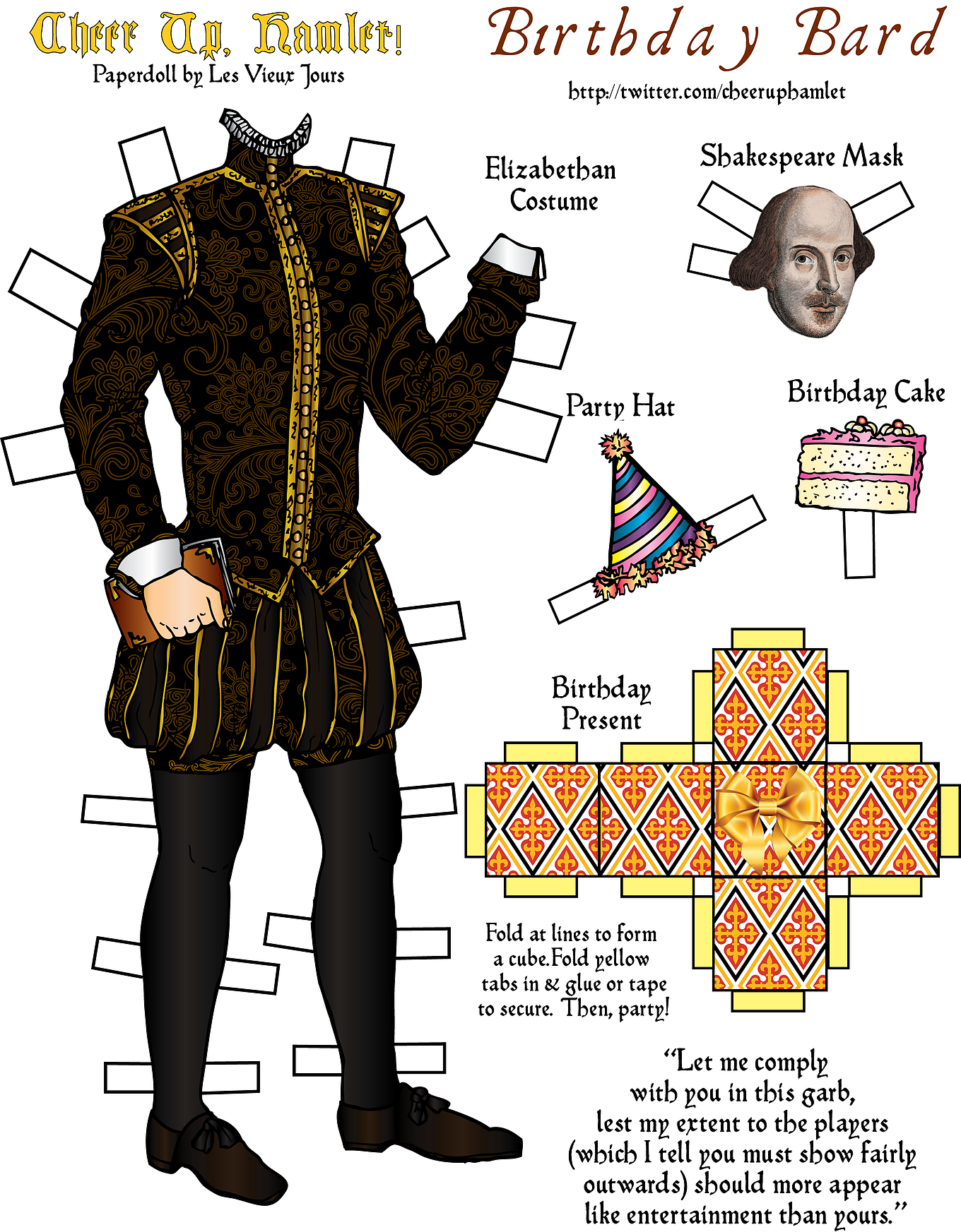 Print, color and cut out this Shakespeare birthday paper doll and his fun party accessories. Grab a cupcake and celebrate with the Bard!