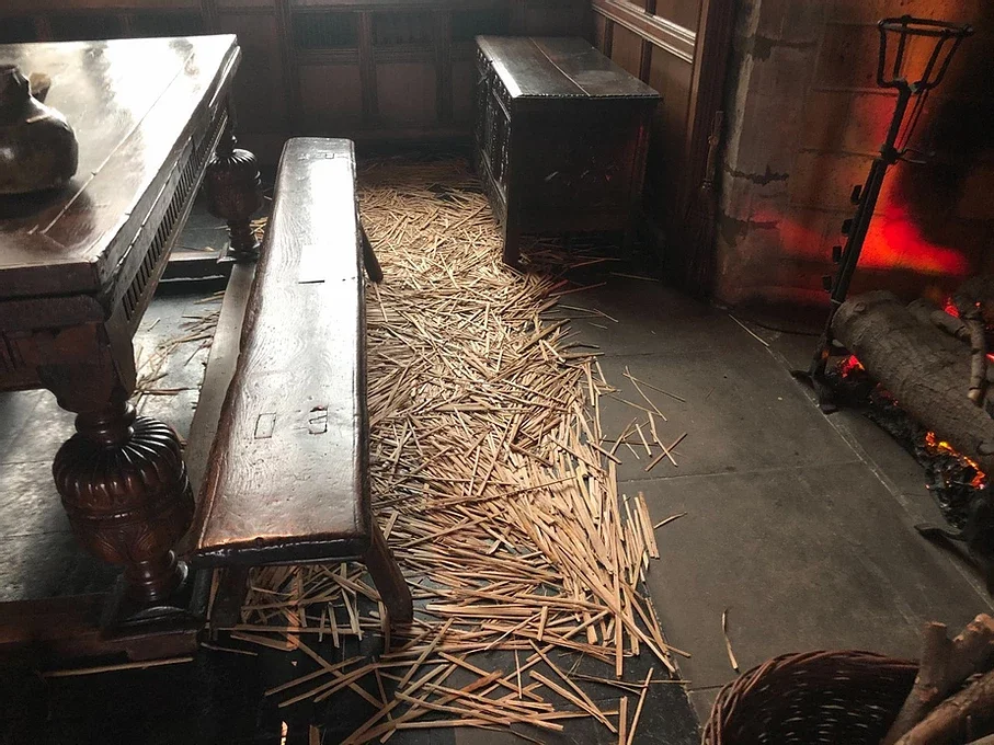 If you visit Agecroft Hall, you might notice something interesting in the Great Hall. On the floor, you will see something that looks like straw. These are rushes, and they are meant to help protect the floor and make the floor easier to clean. At Agecroft, we have the rushes in one part of the room for safety reasons, but in the 1600s the rushes would be all over the floor. The rushes would have had herbs strewn in them. The herbs would release their scent as people walked over them, which would make the room smell sweet.