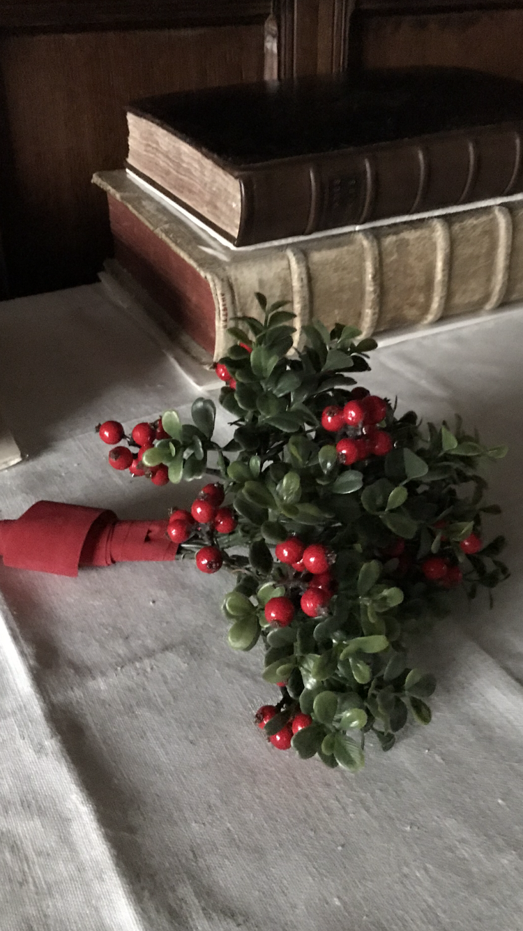 The kissing ball, or bough, comes to us from the Middle Ages. During this time, villagers would wind together twine and evergreen branches into a ramshackle ball shape. In the center of this conglomeration of evergreen boughs they would place a clay figure of an infant to represent the baby Jesus. These “holy boughs”, as they were called, would be hung from the ceiling along passageways in castles and big houses to render blessings and good luck to all who passed under the bough and the Holy Infant.