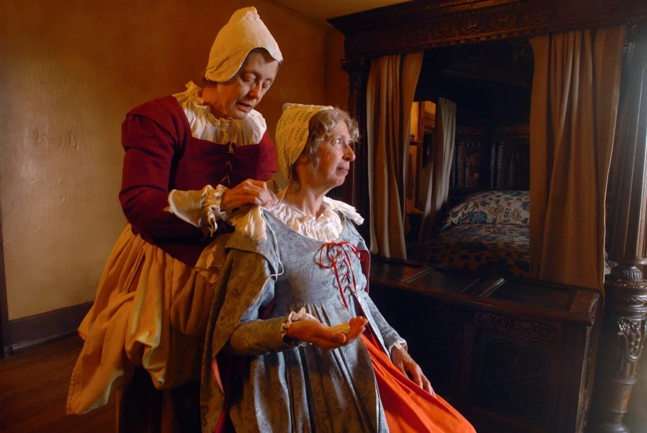 Mistress Dauntesey is depicted here by a member of our Living History staff and attended by her lady’s maid who is helping her to get dressed. You can quickly see the differences in the clothing that each is wearing. The Daunteseys were wealthy landed gentry and their servants fell below the smaller yeoman farmers and the middle-class merchants in the social hierarchy of Tudor England.