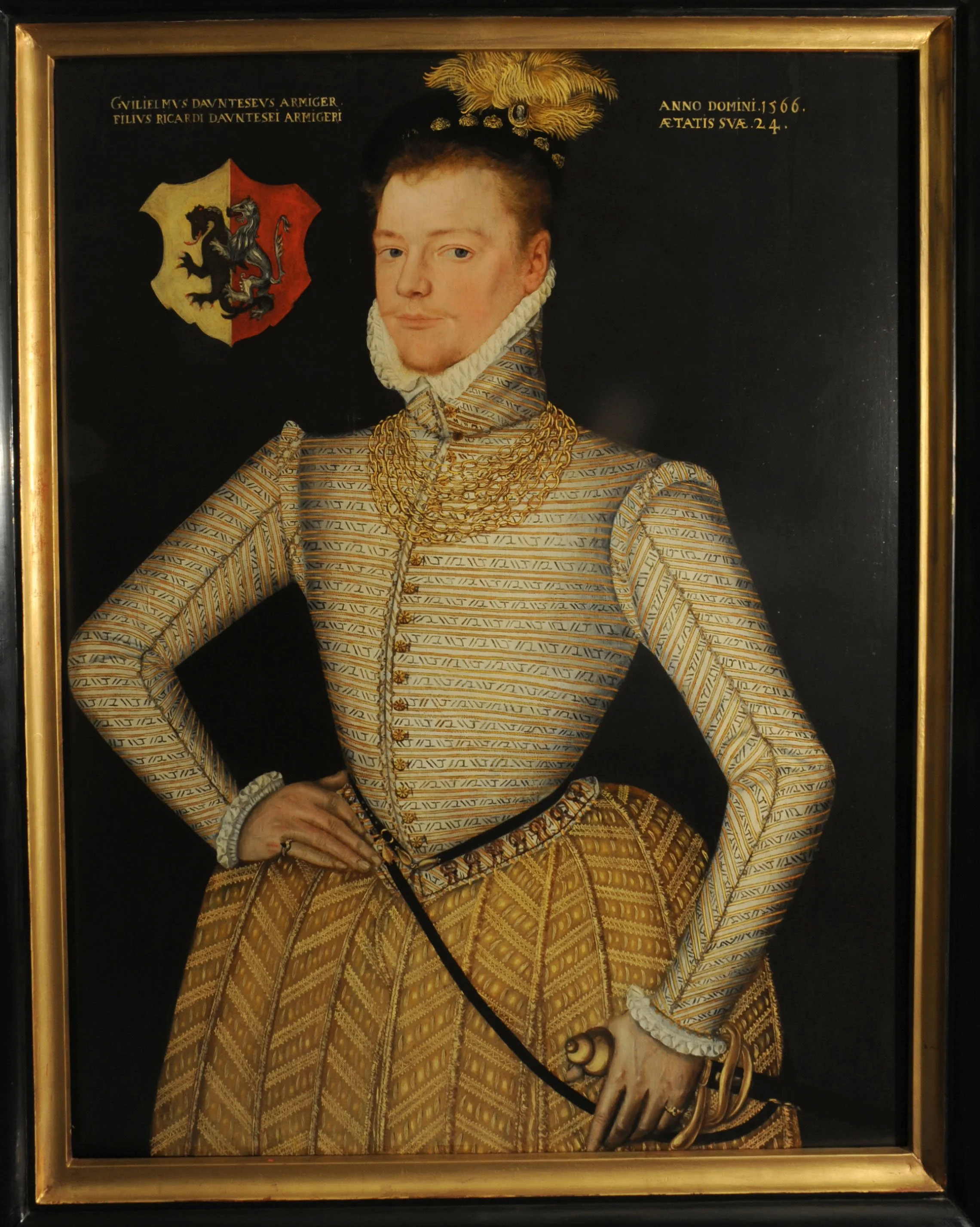 In the portrait, William poses proudly in an elegantly tailored gold and white outfit. Atop his head is a black, beaver fur cap decorated with a jaunty ostrich feather and an antique cameo. In the upper left of the painting is the Dauntesey coat of arms and a Latin inscription naming the subject as the son of Richard Dauntesey. On the upper right is the date of the painting, 1566, and the subject’s age, 24. Together these visual clues allow us to identify William as a member of a wealthy wool merchant family in Wiltshire. The family also held property in London, Middlesex and Essex. His father, Richard was in service in the courts of Queens Jane Seymour and Katherine Howard and then in service to Lady Mary before and after she became Queen Mary I. Sadly, his father died in 1557 when William was only 15 years old.