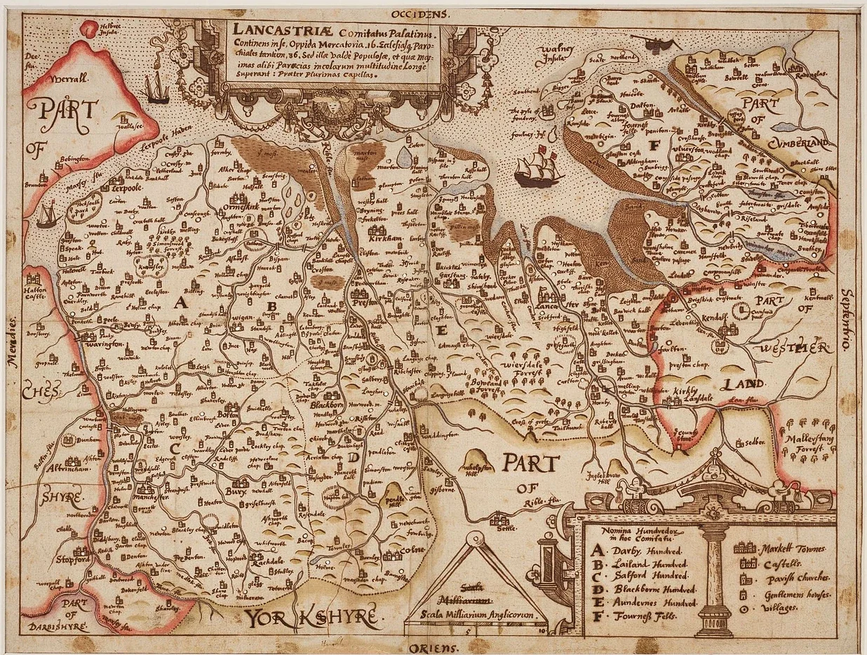 Agecroft Hall originally sat in Lancashire, in the north-west of England in the area of Salford Hundred (similar to a county in one of the United States). Today this is part of the region known as Greater Manchester. A manor like Agecroft Hall would have benefited from local and international buying, selling and trading. In 1612, rural Lancashire had 15 market towns.