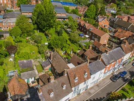 As they travel further into town toward the market cross, they notice the permanent shops located along the perimeters of the town. These long and narrow plots (burbage plots, or tenements, for which holders, or burgesses, paid an annual rent to the lord), each have a building of three or four stories built upon it, most made of half-timbering filled in with plaster, and thatched roofs. A few more prosperous owners have homes of stone or brick and with slate roofs.