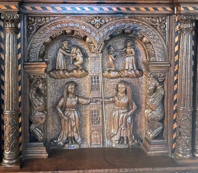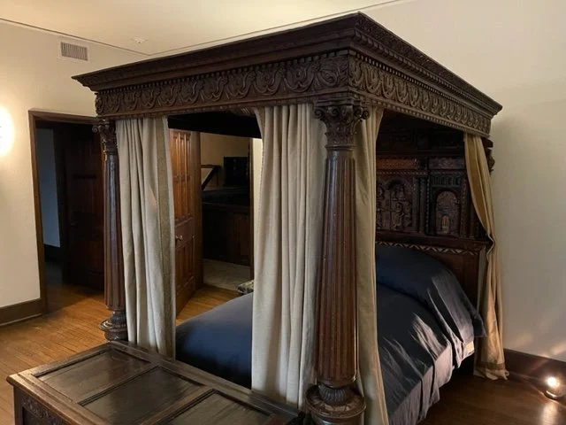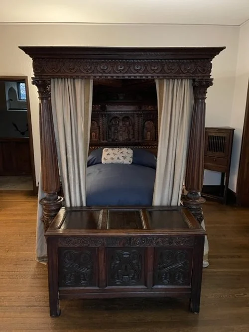 To continue our theme from the last post, the other bed currently on display at Agecroft Hall is a composite bed—a piece made up of three different beds from three different eras. This practice was not uncommon in previous centuries. Rather than throwing away an entire bed when it broke or went out of style, people often reused what they could and then updated or filled in sections with bits from other beds. The bed in the Lady’s Bedchamber was assembled in the nineteenth century. The headboard, so helpfully labelled with the date 1629, depicts the scene of Matthew 25:36: “I was naked, ye clothed me; I was sick, and ye visited me; I was in prison and ye came unto me.” The headboard is beautifully carved and features detailed inlay work as well.