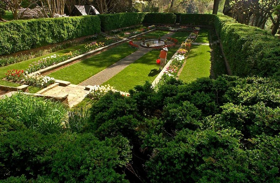 Agecroft Hall and Gardens Has a beautiful sunken garden. It shines during the spring, when it is filled with tulips. But it is full of lovely flowers and plants at year round. People living in Virginia might be familiar with other sunken gardens, such as the one at The College of William and Mary and one at The Carillon in Richmond. This style of garden gained popularity in England in the eighteenth century. The flowing open spaces of sunken garden were a change from the formal knot gardens that had been popular in Tudor times.