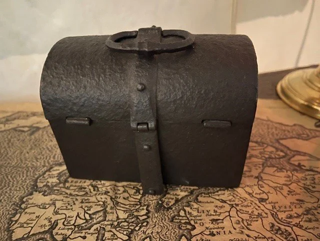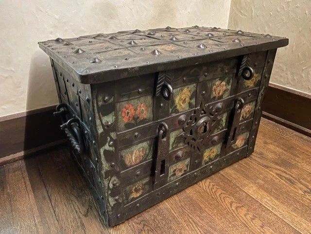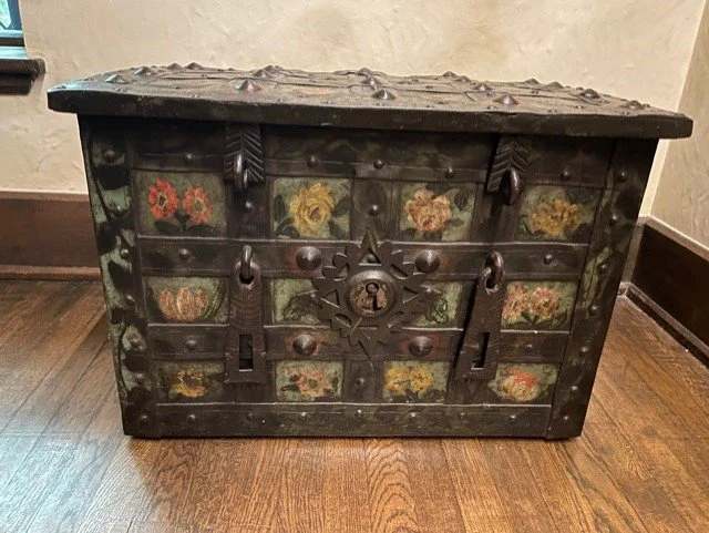 Our largest strongbox is about eighteen inches tall and thirty inches wide. Made of black iron, it is decorated with crisscrossing metal straps which frame squares featuring colorful, painted flowers. The most exciting part of this box is its locking mechanism. When looking at the box, it appears the lock is on the front of the box. This decoy is a safeguard measure while the real lock is actually recessed under a metal plate on the top of the box. If an unsuspecting thief were to attempt to open the box using the fake locks, large steel spikes would shoot out towards him. While this protective measure might seem flimsy to us, the box’s weight and booby-trapped locks were the height of security in the 17th century.