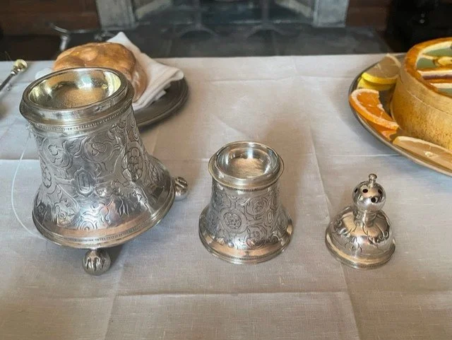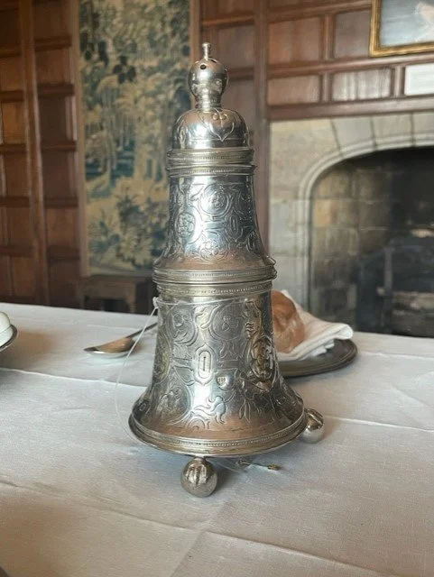 The Great Salt, or Bell Salt, is on display in our dining parlor. Shaped like a bell, the Great Salt is a silver, three-piece object, which held salt in little trays in each of the two lower sections and ground pepper in the finial cap. This late Elizabethan example, dated 1591, is engraved with strap work and flowers and would serve the Lord of the Manor, his family, and his guests. The Lord would get his own, covered, container of salt and his family and guests would share the lower, uncovered section. Coincidentally, the Lord also got the peppershaker. Great Salts were commonplace in homes like Agecroft and were a smaller version of medieval Bell Salts. Our Great Salt has two replacement parts—the cap and middle section, but when those pieces were created is unknown.
