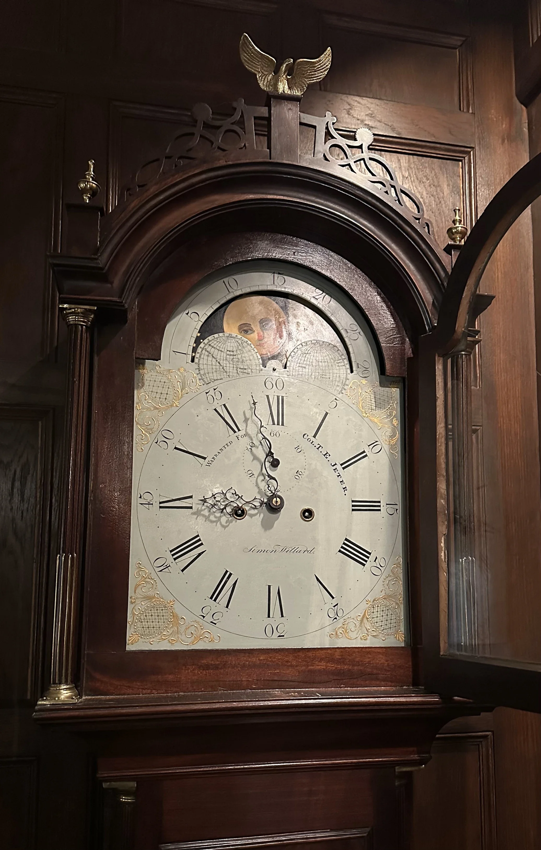 Willard was considered the most important clockmaker of his time. His clocks are still displayed in many colleges, including Harvard, where Willard served as the official clock keeper for over 50 years. They are in many public buildings, like the Senate Chamber in the United States Capitol and many churches. His clocks are features in many museum collections, including ours here at Agecroft Hall. Next time you’re on tour here, be sure to take a minute to spot the Simon Willard tall case clock in the Williams Library.
