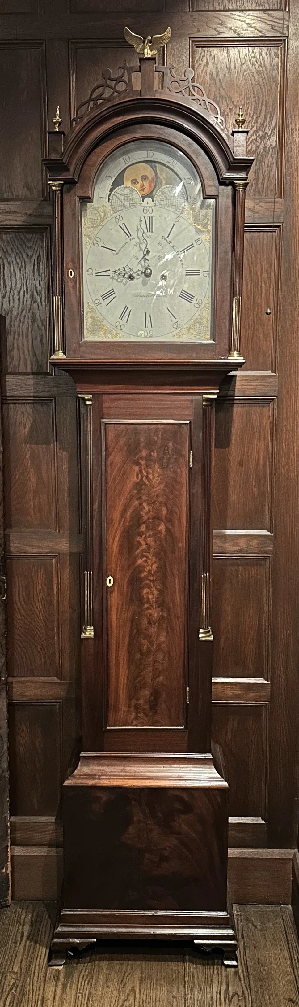 A Simon Willard, Roxbury-style, tall case clock stands in the Williams Library here at Agecroft Hall. Roughly eight feet tall and two feet wide, this piece dates from the early 1800s and has been keeping time for over two hundred years. A proud piece from the Mortons' collection, the clockmaker, Simon Willard (1735-1848) was, perhaps, the most well-known clockmaker of the late 18th and early 19th centuries.