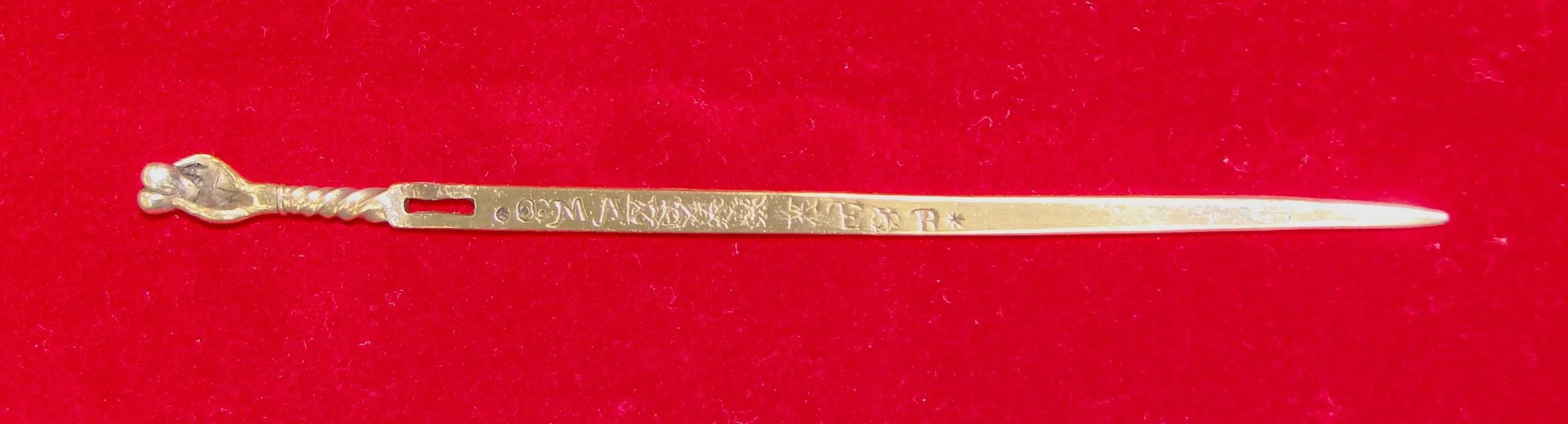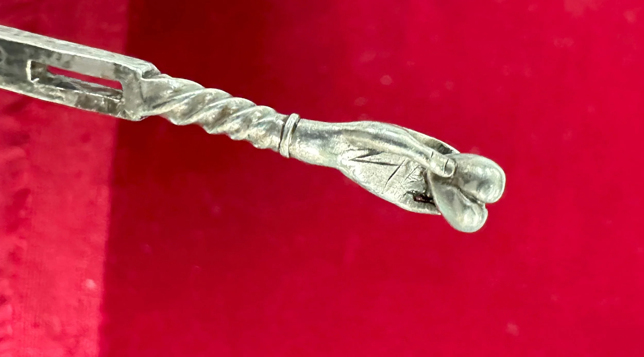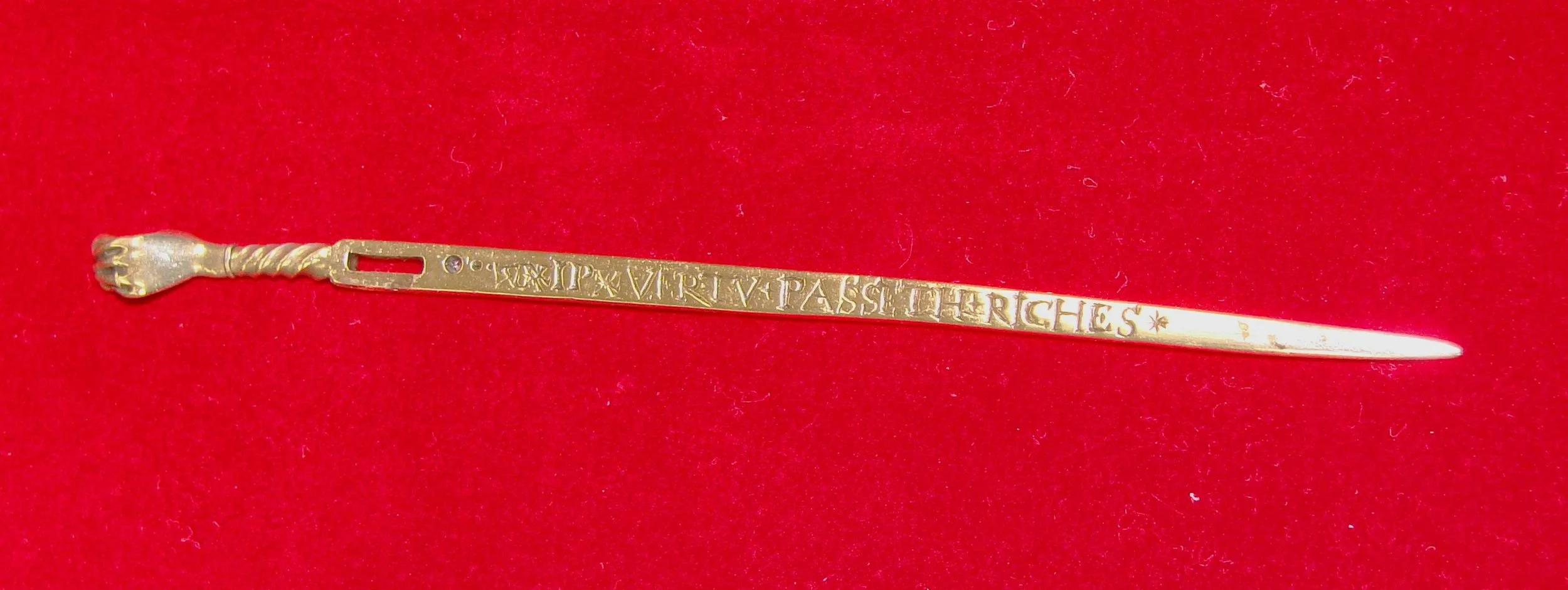 Our piece has a tapered stem, is engraved on both sides, and ends in a hand clutching a heart. The engravings have been altered at some point during its life, but it appears to say “I.P.-Vertu-Passeth + Riches” on one side and the initials “M.A” and “E.B” on the other side. This was probably originally intended as a gift, marked by the small heart.