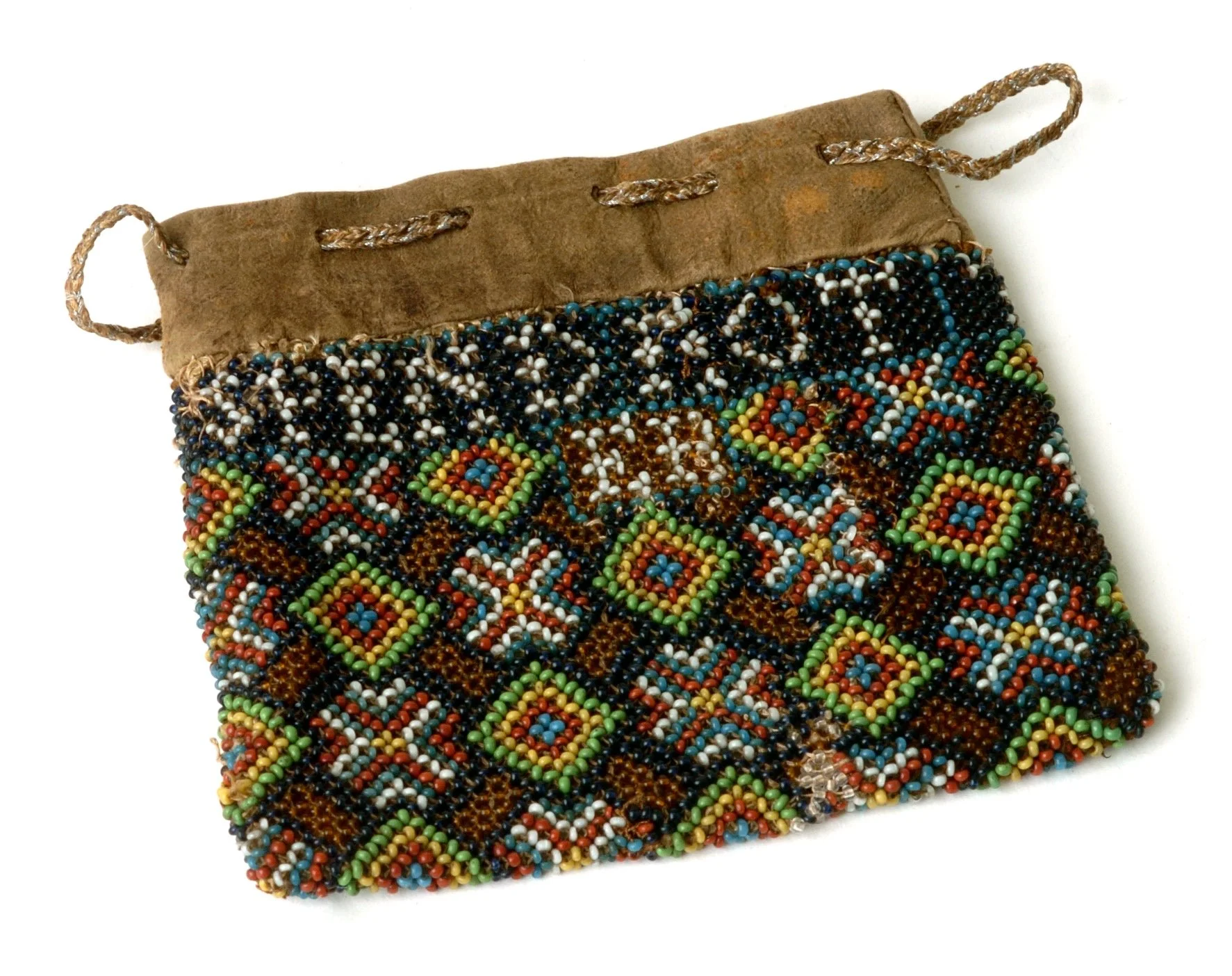 With a top made of leather and embroidered with glass beads, this small drawstring purse was probably made at home and assembled from purchased items. The alternating diamond and cross patterns were embroidered with red, green, blue, and white beads imported from Venice, Paris or Antwerp—cities that were producing superb polychrome glass beads by the 16th century. The beads were sewn onto a silk knit and then attached to the buckskin leather pouch. This bag, which would have made an attractive gift for a friend, was personalized with the inscription Spend not too fast and embroidered with the date 1629 and the initials E.B.