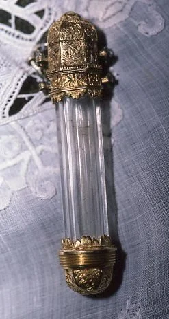 This small vial, also called a perfume flask or a smelling vial, held perfume and could be worn as a pendant on a necklace, stuck in a purse, held in a muff, or tied to a girdle. Perfume was important in everyday seventeenth century life as a way to ward of the daily stench of life and was applied to anything and everything—skin, clothing, gloves, hair, etc. Men and women often wore the same scents.