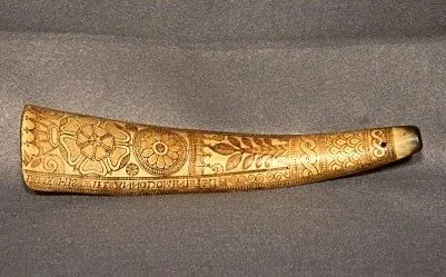 This shoe horn, about nine inches long, was engraved by Robert Mindum in 1613. Inscribed along the outer edge ‘ROBART MINDVM [sic] MADE THIS SHOOING HORNE FOR…IANE [sic] HIS WIFE ANNODOMINI 1613,’ the piece is also etched with a variety of stylized floral and geometric designs: a Tudor rose topped with a crown, a small, round flower encased in a circular band containing diamond shapes, and a stylized tree with large, symmetrical leaves. The narrow end of the horn contains swirling geometric patterns and scales. Shoe horns were often times given as a gift and became necessities during the Renaissance due to the rise in popularity of soft backed, flexible shoes. There are twenty-one known Mindum shoe horns and each is dedicated to a single person and inscribed with a year; obviously, these were intended as gifts.