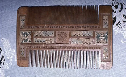 During the medieval period, ornamental “H” shaped combs were highly valued in Europe as love gifts from a gallant to his lady. The combs were often carved as a set with mirrored cases and ‘gravoirs’ and formed part of the fittings of the dressing cases used by nobility. Hair was worn in a variety of styles and a lady or her maid would comb out tangles nightly. The side of the comb with the tight teeth was very helpful in combatting head lice, a common problem for many people of the time.